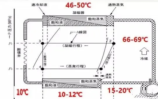按照經驗,系統的冷凝溫度=環境溫度+(10~15℃);我們以夏天環境溫度35℃空調為例子。